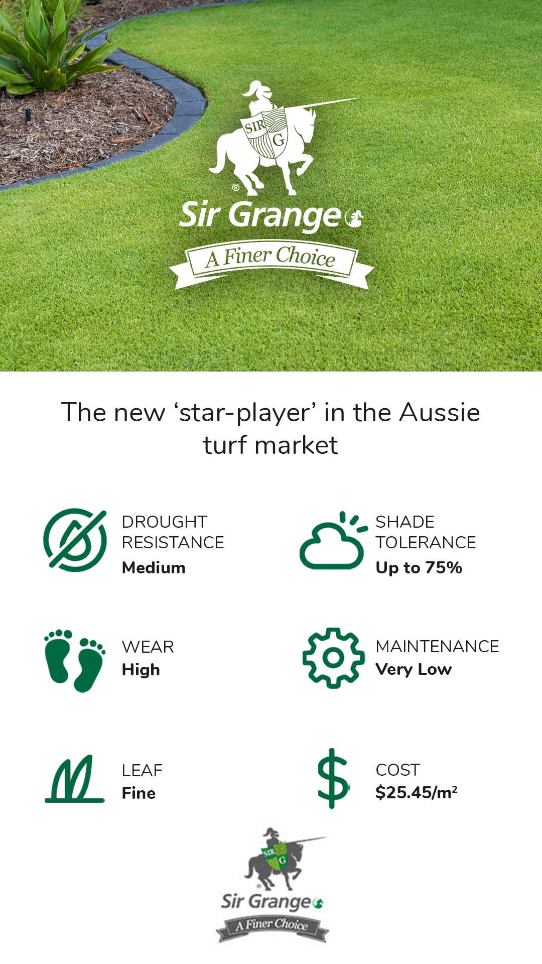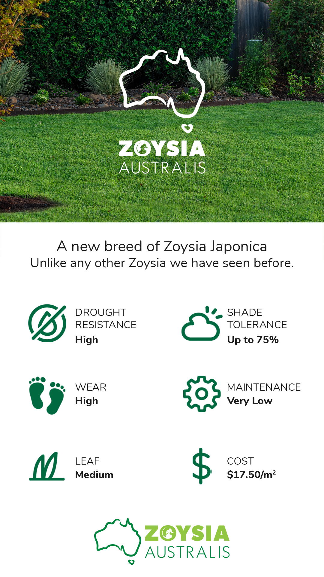 Medium texture. Elegant blue-green tone.Superior recovery and durability, built for modern Australian landscapes.